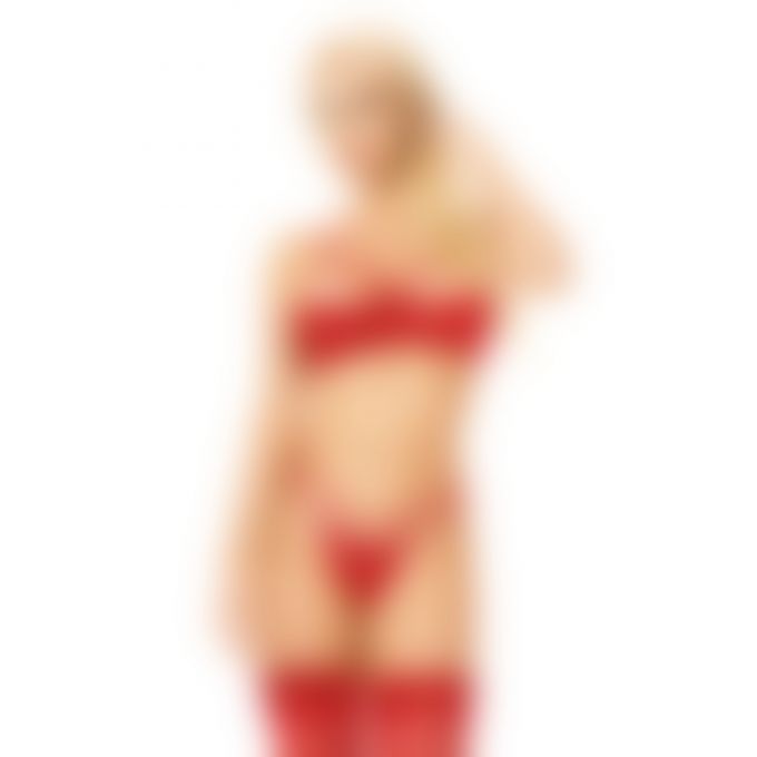 Розкішний комплект білизни в червоному кольорі. Виконаний з сітчастої тканини з мереживними вставками у квітковий візерунок в поєднанні з тонкими еластичними смужками, що ефектно кріпляться до комплекту за допомогою тонких золотистих кілець, підкреслюючи всі принади. Бюстгальтер на тонких бретелях з напівчашками, трусики-стринги з пікантним розрізом, задня деталь повністю виконана з еластичних смужок.Характеристики Комплект білизни - Kristi, red