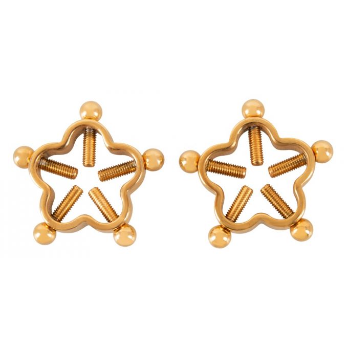 Вишукані затискачі для сосків, що за зовнішнім виглядом нагадують елегантні прикраси в квітковому дизайні. Виконані в золотистому кольорі з високоякісної нержавіючої сталі. Оснащені 5-ма гвинтиками, якими можна регулювати рівень стиснення від м'якого до жорсткого, залежно від уподобань. Зовнішній діаметр 2.3 см, внутрішній регульований діаметр 0.5 – 1.9 см. Аксеусуар ідеально підійде для розваг у стилі БДСМ, подарує як чуттєву стимуляцію, так і звабливий вигляд.Характеристики Затискачі для сосків - Bad Kitty Nipple Jewellery Gold