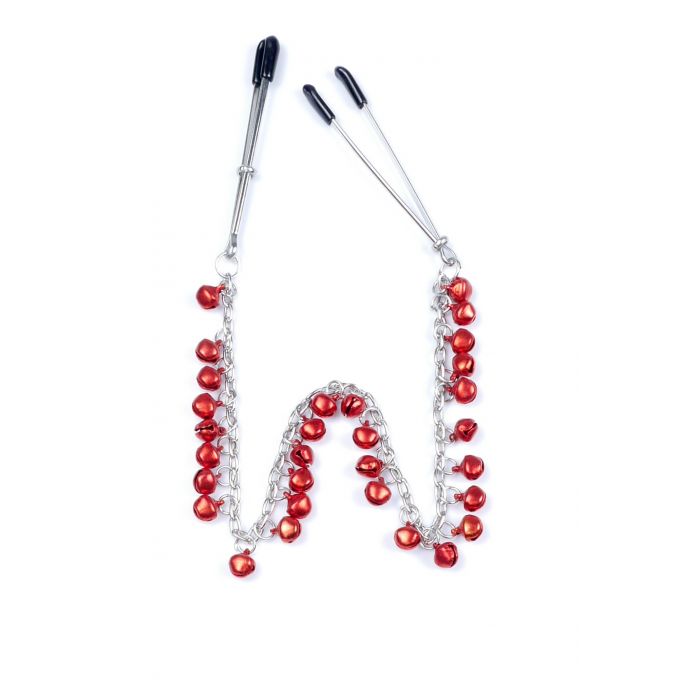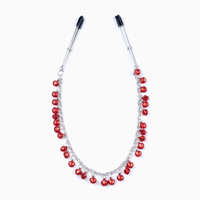 Стильні затискачі для сосків, виконані у вигляді довгого елегантного ланцюжка, прикрашеного червоними дзвіночками, які мелодійно звучать при найменших рухах. Рівень стиснення регулюється за допомогою повзунків на затискачах. На кінцях затискачів є м'які накладки, які захищають ніжну шкіру від пошкоджень. Довжина - 39 см.Характеристики Затискачі для сосків - Exclusive Nipple Clamps No.5 - Fetish Boss Series
