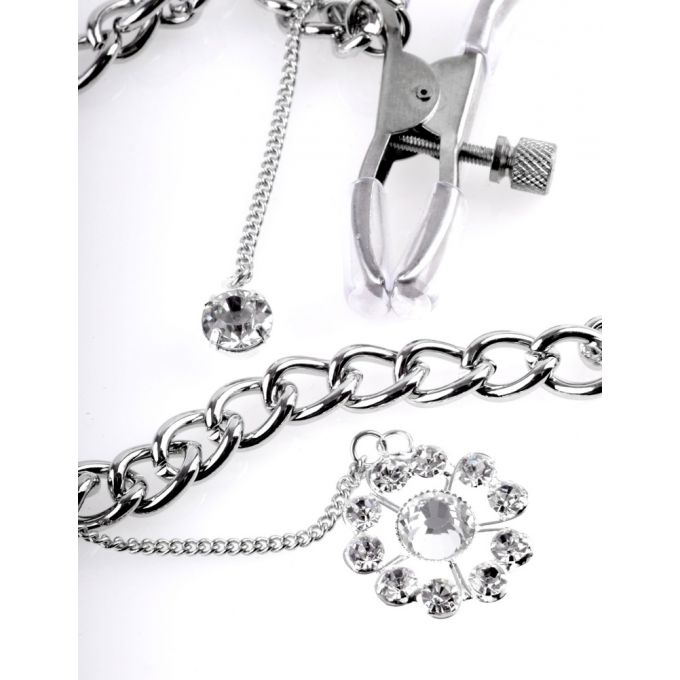 Вишукані затискачі для сосків з нержавіючої сталі, що за зовнішнім виглядом нагадують дорогоцінну прикрасу. З'єднані між собою елегантним сріблястим ланцюжком. Рівень стиснення регулюється гвинтовим механізмом, залежно від уподобань, а для запобігання пошкодження сосків передбачено м'які накладки. Оздоблені підвісками: маленькі лаконічні кристали біля кожного затискача та підвіска у квітковому дизайні на з'єднувальному ланцюжку. Аксеусуар ідеально підійде для розваг у стилі БДСМ, подарує як чуттєву стимуляцію, так і неймовірно звабливий вигляд.Характеристики Затискачі для сосків - FFS Crystal Nipple Clamps