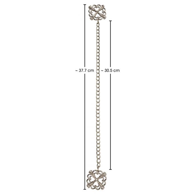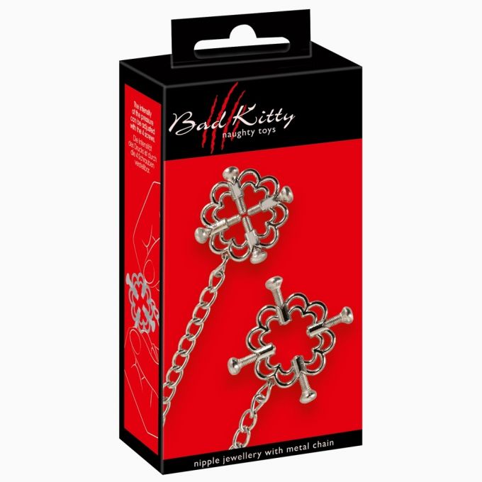 Вишукані затискачі для сосків, що за зовнішнім виглядом нагадують справжню дорогоцінну прикрасу. Виконані з високоякісної нержавіючої сталі у формі двох елегантних квіток, з'єднаних між собою довгим ланцюжком. У кожній з квіток є чотири гвинти, якими можна регулювати інтенсивність стискання, залежно від уподобань. Зовнішній діаметр - 3.6 см, довжина ланцюжка - 30.5 см. Аксеусуар ідеально підійде для розваг у стилі БДСМ, подарує як чуттєву стимуляцію, так і звабливий вигляд.Характеристики Затискачі для сосків - Bad Kitty Nipple Jewellery