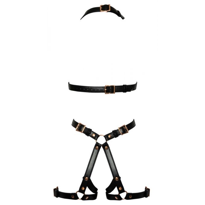 Ексклюзивна портупея з м'яких чорних ременів з матовим блиском та рожевого золота металевими деталями. Ремені регулюються для ідеальної посадки. Відкриті зони бюсту, живота та промежини додають пікантності.