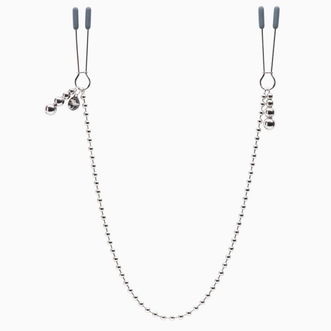 Сріблясті затиски для сосків з лімітованої колекції "Fifty Shades of Grey". Виготовлені з високоякісного нержавіючій сталі, затиски покриті силіконовими накладками для запобігання ушкодженням шкіри. Міра затиску регулюються спеціальним механізмом. Декоровані невеликими ланцюжками з намистин.513 грн