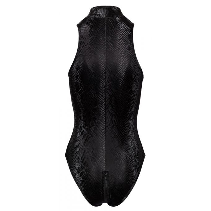 Виготовлене з еластичної тканини з мокрим ефектом у чорносірий візерунок змії. Оснащене комірцем-стійкою і застібкою-блискавкою від коміра до сідниць.