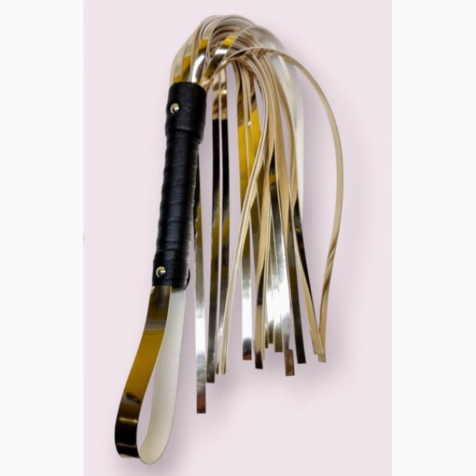 Розкішний флогер у чорно-золотистій кольоровій гаммі для сміливих розваг та експериментів у стилі БДСМ. Аксесуар виконаний з високоякісного жорсткого матеріалу з лаковим покриттям. Пишний хвіст із великої кількості смужок подарує неймовірні гострі відчуття та нові емоції. Для зручного утримування в руці передбачене міцне руків'я та петелька для підвішування. Загальна довжина - 60 см.Характеристики Батіг Flirty, еко-лак, золотий, 60 см