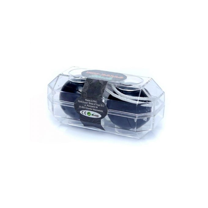 Чорні вагінальні кульки з гладкою поверхнею та діаметром 3,2 см. Усередині кожної кульки – тягарець, що створює вібрацію під час руху. З'єднані текстильним шнурочком з петелькою для зручного користування.