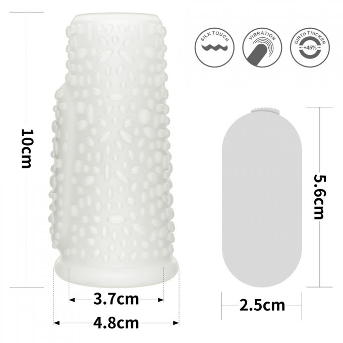 Відкрита вібронасадка на пеніс із щільного білого еластичного матеріалу, гіпоалергенна та безпечна. Поверхня покрита рельєфом із численних пухирців для стимуляції. Збільшує обхват члена на 45% і допомагає затримати еякуляцію. Віброелемент зі спеціальною кишенею має один потужний режим вібрації. 🔥