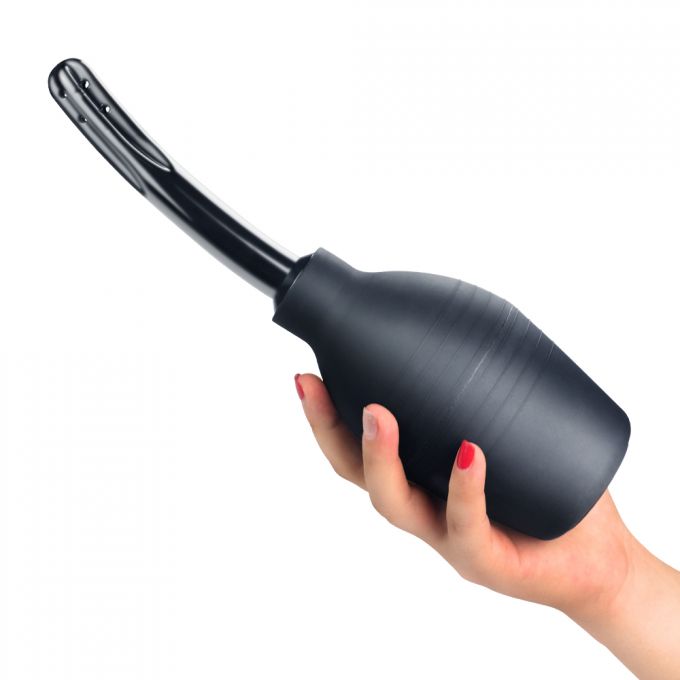 Інтимний душ чорного кольору з м’якою грушею та зігнутою гладкою насадкою. Виготовлений із якісних матеріалів для зручних анальних і вагінальних гігієнічних процедур.