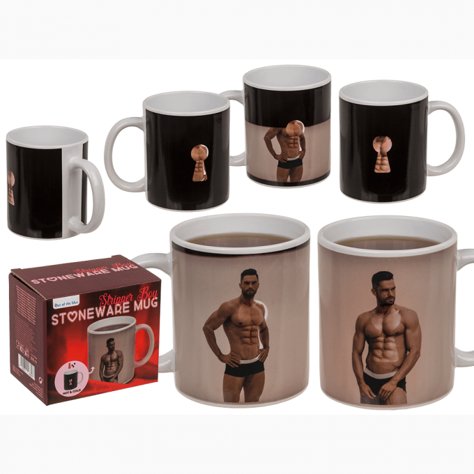 Провокаційна чашка з термоефектом. У неробочому стані чашка чорного кольору із замковою щілиною, яка при наливанні гарячого напою розширюється і відкриває зображення напівоголеного чоловіка із досконалим пресом, що здатен пробудити найсміливші фантазії. Зображення двостороннє. Аксесуар, який окрім гарячих напоїв, зможе показати еротичне шоу. Ідеальний універсальний подарунок для справжніх поціновувачів еротики. Об'єм - 300 млХарактеристики Чашка з термоефектом Stoneware Mug Stripper Boy, 300 мл