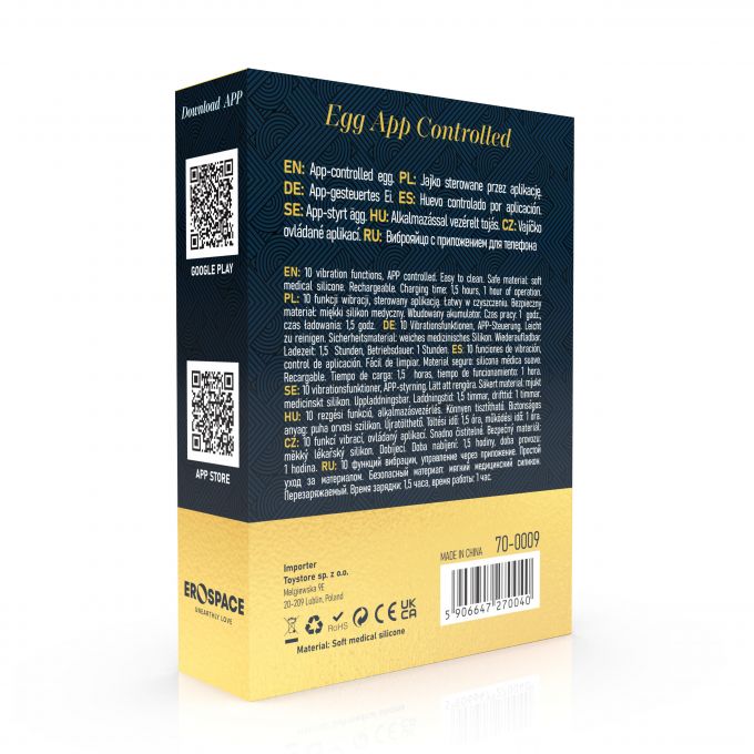 Компактний, але потужний гаджет для яскравих відчуттів. Керувати ним можна через додаток або за допомогою кнопки на корпусі. 10 режимів вібрації дозволяють легко підібрати потрібний ритм та інтенсивність, а зручна форма робить його однаково приємним як для використання наодинці, так і для ігор удвох. М’який силікон з оксамитовим покриттям приємний на дотик і безпечний для шкіри. Завдяки захисту від вологи за стандартом IPX6 його можна брати навіть у душ. Пристрій забезпечує комфорт без зайвого шуму. Акумулятора вистачає приблизно на годину, а зарядка відбувається за допомогою USB. Розміри – 10,5 × 3,4 см. Вага – 88,5 г.Характеристики Віброяйце - Erospace Sweet Play Egg App Controlled A9