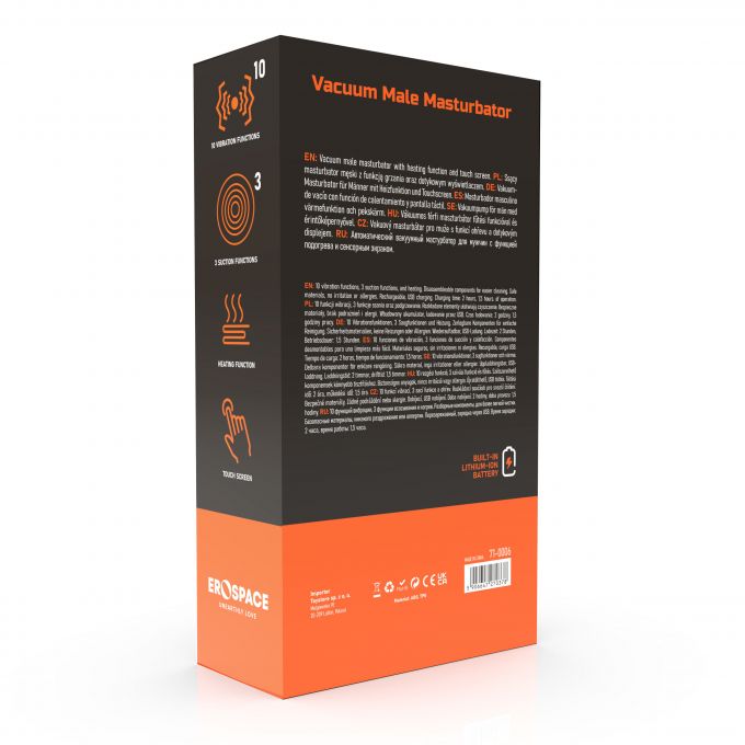 Чоловічий мастурбатор, який поєднує функції вібрації, всмоктування та підігріву, створюючи максимально реалістичні та приємні відчуття. Завдяки 10 режимам вібрації та 3 режимам всмоктування ви зможете обрати ідеальну інтенсивність для своїх потреб. Функція нагріву імітує природне тепло тіла, а сенсорний дисплей робить керування простим та інтуїтивним. Додатково пристрій оснащений голосовим режимом: підключивши навушники, ви можете насолоджуватися еротичними звуками, які підсилюють ефект. Внутрішня вставка виготовлена з м’якої кібершкіри, яка дарує відчуття, максимально наближені до реальності. Пристрій легко розбирається для очищення, що гарантує зручність у догляді. Міцна конструкція та безпечні для шкіри матеріали забезпечують комфорт і надійність під час використання. Вбудований акумулятор забезпечує до 1,5 години роботи після повної зарядки. Довжина – 25,5 см, діаметр – 9,1 см, довжина рукава – 13,1 см, внутрішній діаметр – 3-5 см. Вага – 666 г.Характеристики Мастурбатор - Erospace Men’s Play Vacuum Male Masturbator B6