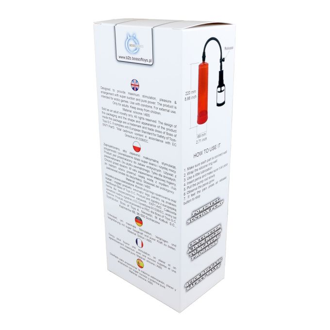 Чоловіча вакуумна помпа. Аксесуар виконаний з високоякісних гіпоалергенних матеріалів, складається з прозорого циліндра з вимірювальною шкалою та зручного ефективного механізму, за допомогою якого відкачується повітря. Регулярне використання вакуумної помпи дає стабільний та помітний результат, сприяє збільшенню розмірів статевого члена і посилює ерекцію.Характеристики Вакуумна помпа - Powerpump MAX - Red