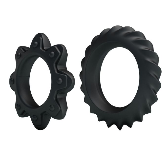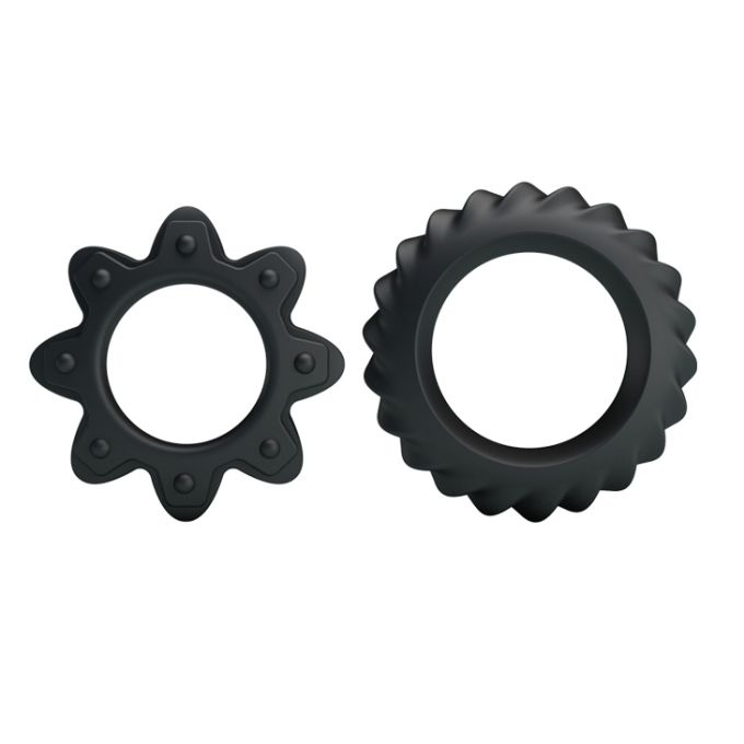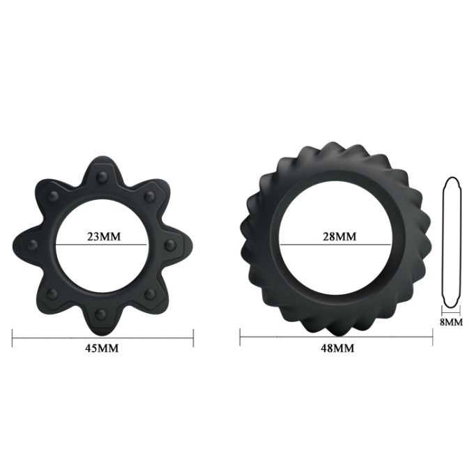 Два ерекційних кільця чорного кольору. Зроблені з м'якого і еластичного матеріалу, безпечного дня здоров'я. Кільця різного діаметру з різним рельєфом на поверхні. Кільце легко одягається на пеніс, перешкоджає відтоку крові, чим робить ерекцію більш сильною і тривалою. Діаметр - 2,3 см, 2,8 см.Характеристики Ерекційні кільця - Ring Flowering