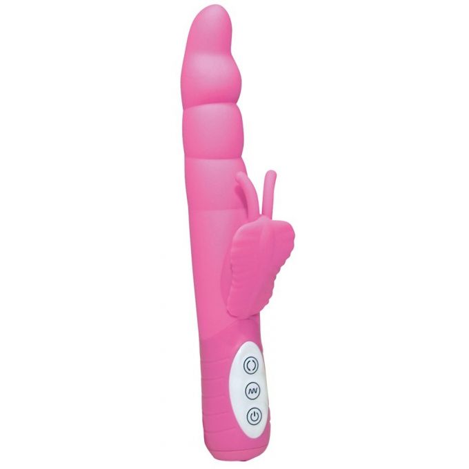 Багатофункціональний вібратор вражає своїм модним дизайном і формою з плавними потовщеннями для посилення відчуттів. Стимулятор клітора у вигляді метелика з вусиками. Має сім мір вібрації, обертання вліво-управо. Довжина 24 см, діаметр від 2,5-3,5 см Матеріал: силікон, ABS. Батареї: 3 x AAA ( у комплект не входять).